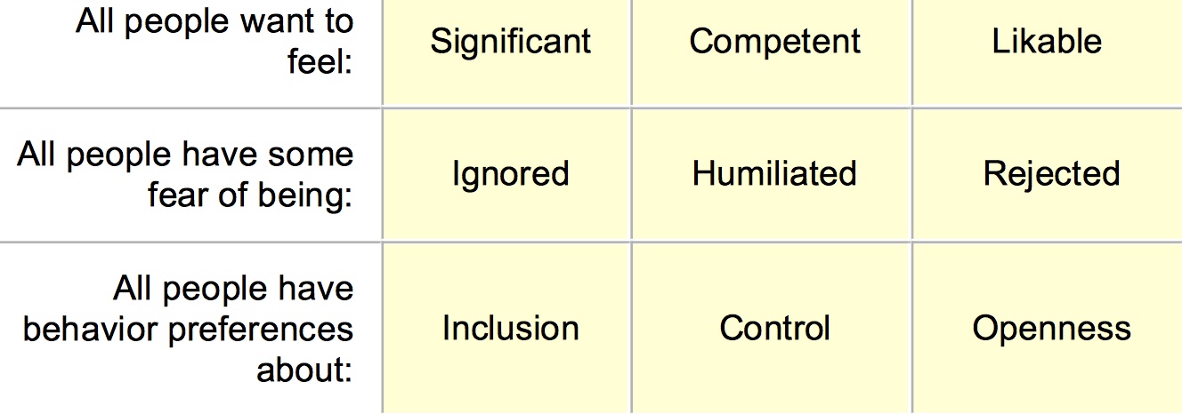A summary of basic human needs as seen by the FIRO theory of interpersonal relations: