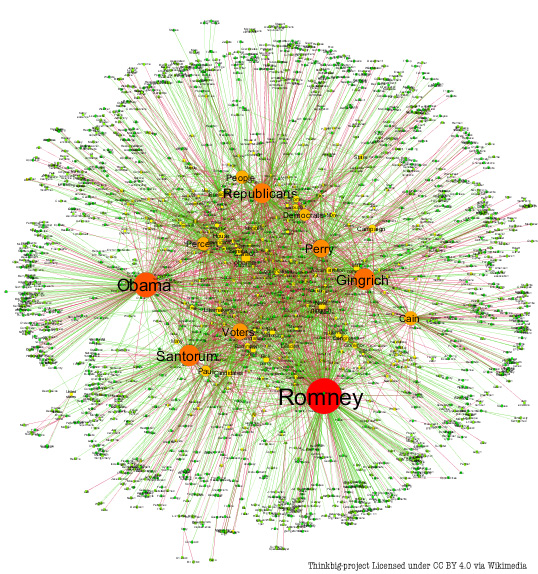 narrative network of US election 2012 – nodes indicate noun phrases, links go from subject to object, color expresses relation of support or opposition.